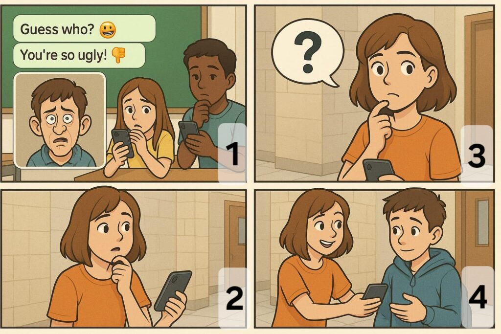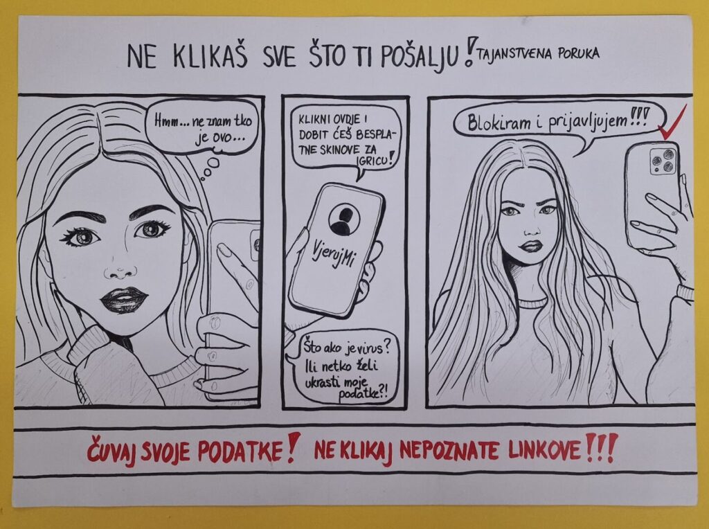 Kao zabavan i kreativan nastavak ove teme, uslijedila je igra „Digitalni detektiv“, projekta u kojem su učenici osmislili i izradili stripove o digitalnoj kulturi i sigurnom ponašanju online. Naši su autori na zanimljiv način prikazali važne poruke o odgovornom korištenju digitalnih alata. Nika je kreirala napeti strip pod nazivom „Tajanstvena poruka“, a Marino i Luka udružili su snage u poučnom stripu o cyberbullyingu.