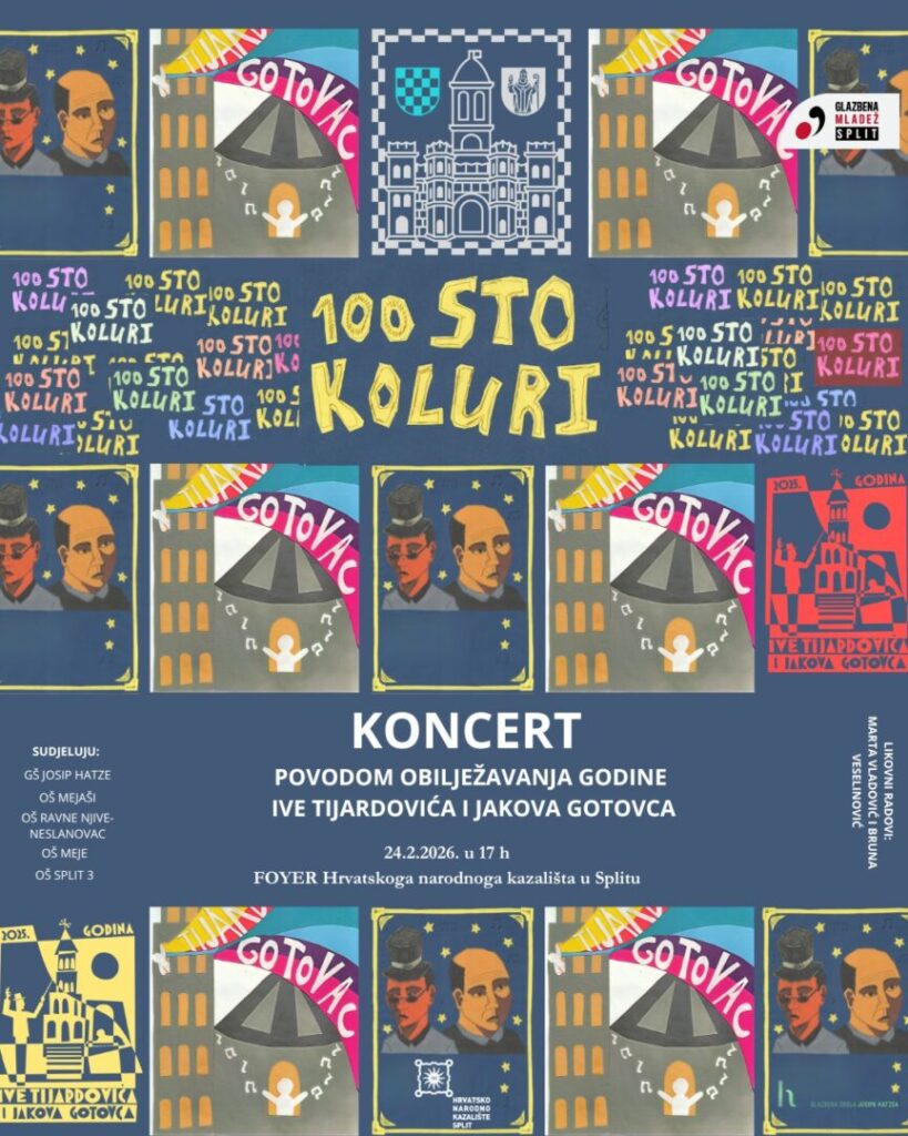 Koncertom Sto koluri u Foyeru HNK Split 24. veljače s početkom u 17 sati dvjesto učenika i profesora osnovnih splitskih škola i Glazbene škole Josipa Hatzea udružit će snage u obilježavanju Godine Ive Tijardovića i Jakova Gotovca.