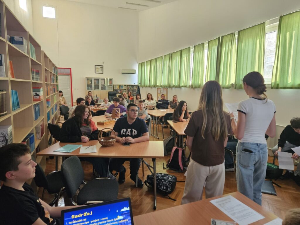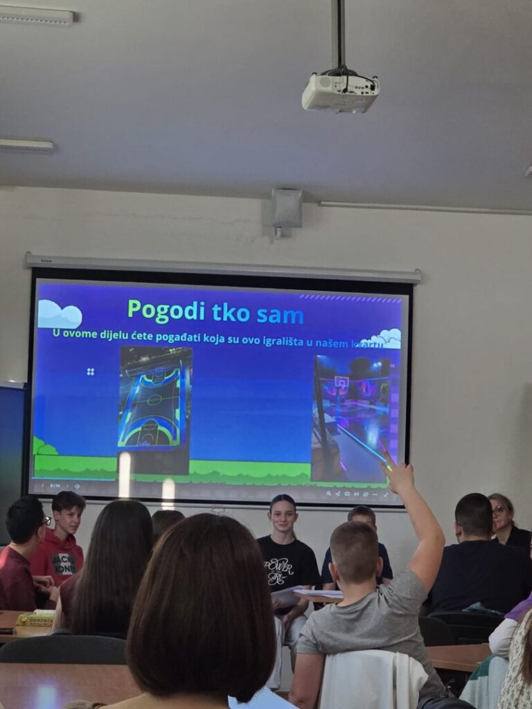 Petu zabavno-poučnu večer u sklopu školskog projekta Stvaram bolji (školski) svijet osmislili su učenici tima Hrvatski jezik, koji su se bavili jednom naizgled jednostavnom, ali iznimno važnom temom – igrom. Proučavali su igrališta na području gradske četvrti Split 3, posebno su se usmjerili na društvene igre i njihovu ulogu u učenju, druženju, razvoju zajedništva i stvaranju ugodnog školskog okružja. Cijela je večer protekla u znaku igre. Odgovor na pitanje Kako igra može doprinijeti boljem školskom svijetu? pronašli su istraživanjem, promatranjem, kreativnim radom i, naravno, igrom. Nakon uvodne igre predstavili su kratki pregled povijesti i razvoja društvenih igara. Otkrili su nam da se ljudi igraju više od 5500 godina, od vremena stare Mezopotamije, iz istog razloga kao i danas zbog potrebe za druženjem i suradnjom. Zaključili su da igra nije gubljenje vremena, nego snažan alat za povezivanje ljudi. Zatim su pozornost usmjerili na igrališta na području Splita 3 i temu igrališta nekad i danas. Istražili su i predstavili igrališta: Krempijevo, Dobrilina, Žrna, Vrh Getaldićeve, Kampus, igralište za balote, školsko igralište, dječji park Split 3, te zaključili kako igrališta nisu samo prostori za igru, nego i mjesta susreta, kretanja i druženja, simboli zajedništva i kvartovskog života te kako je Split 3 splitska četvrt s najviše igrališta. Igrom Pogodi tko sam pokazali su da učenje može biti zanimljivo i interaktivno.